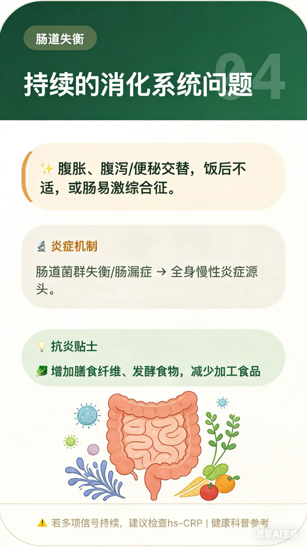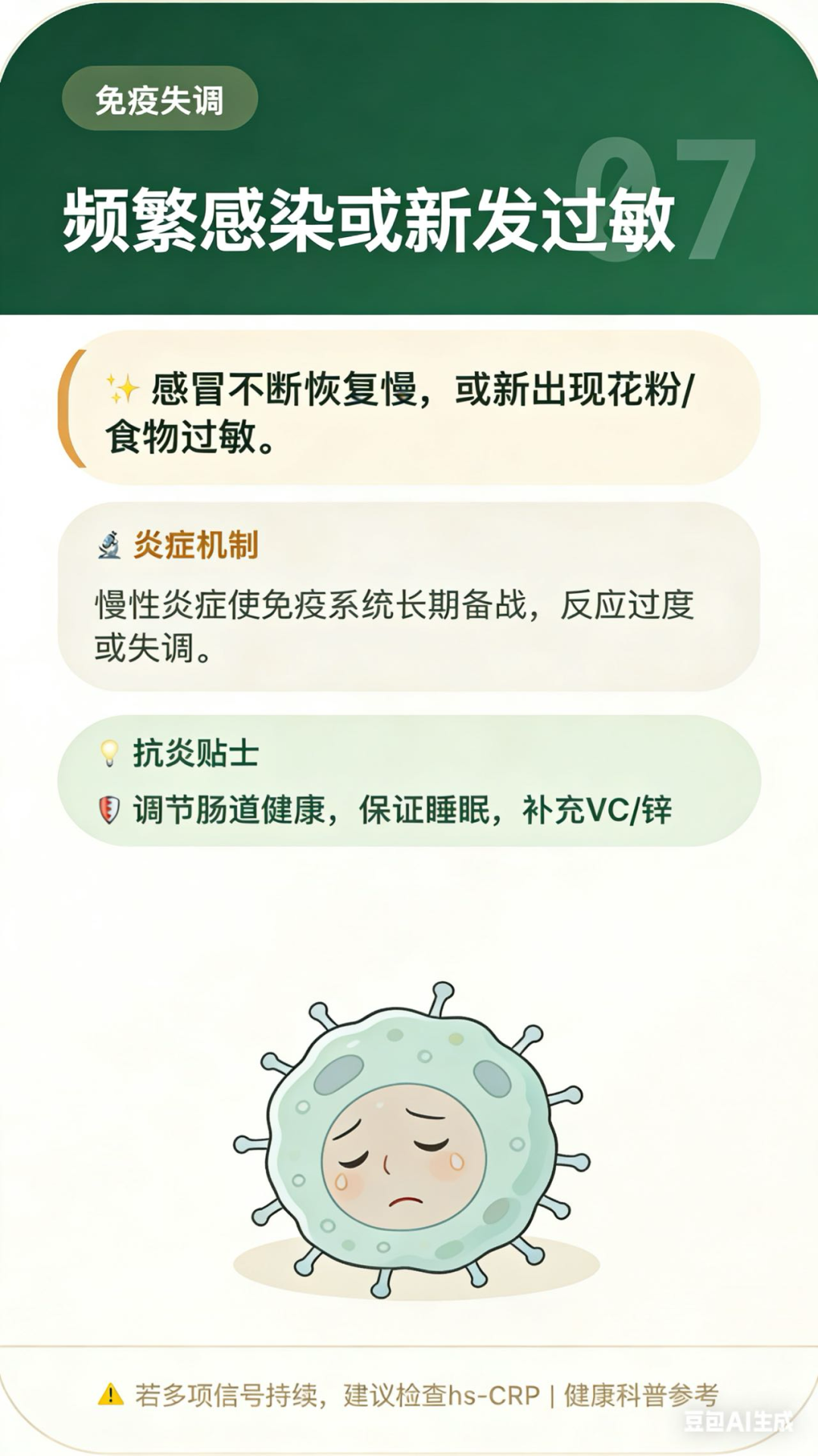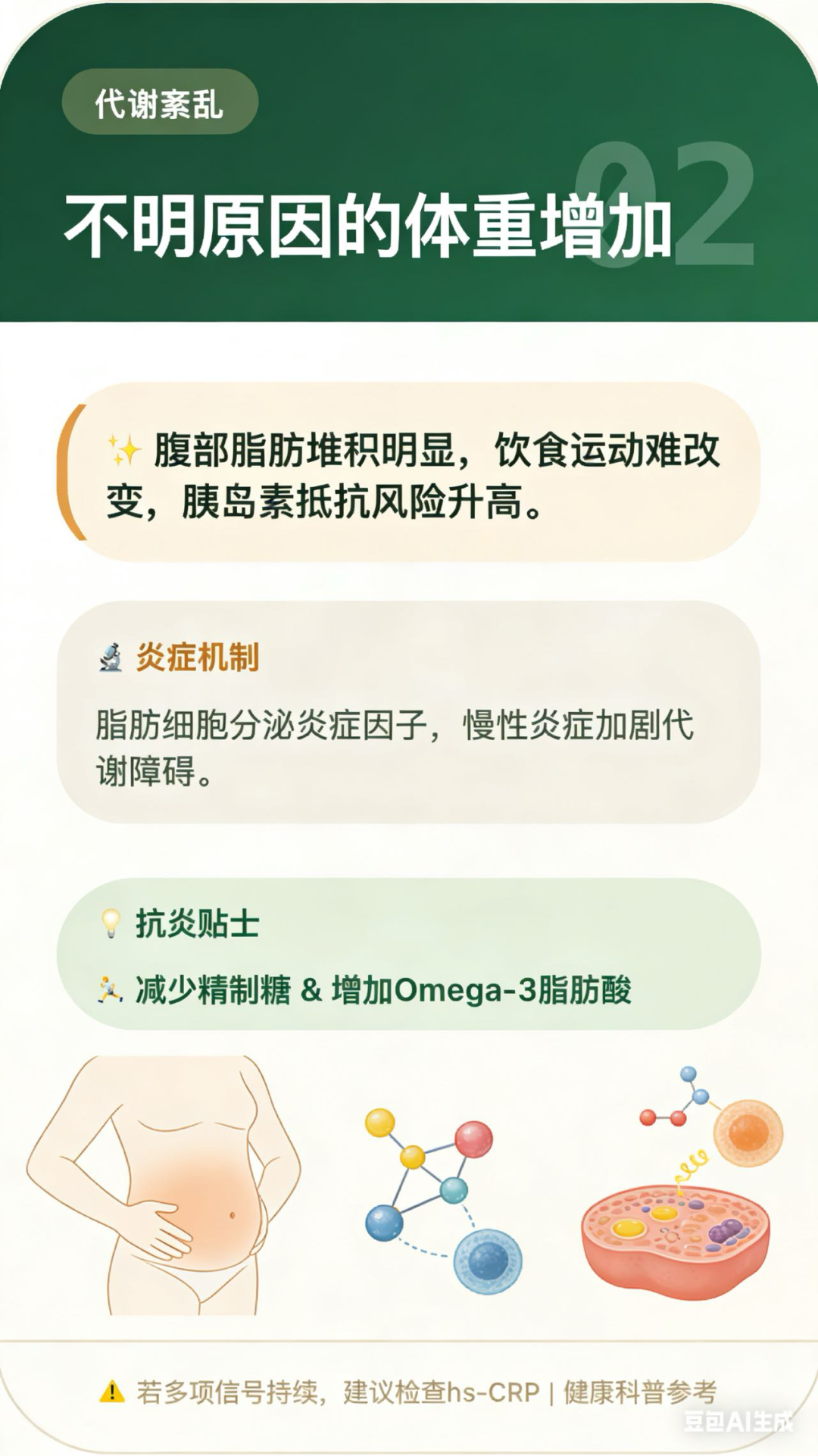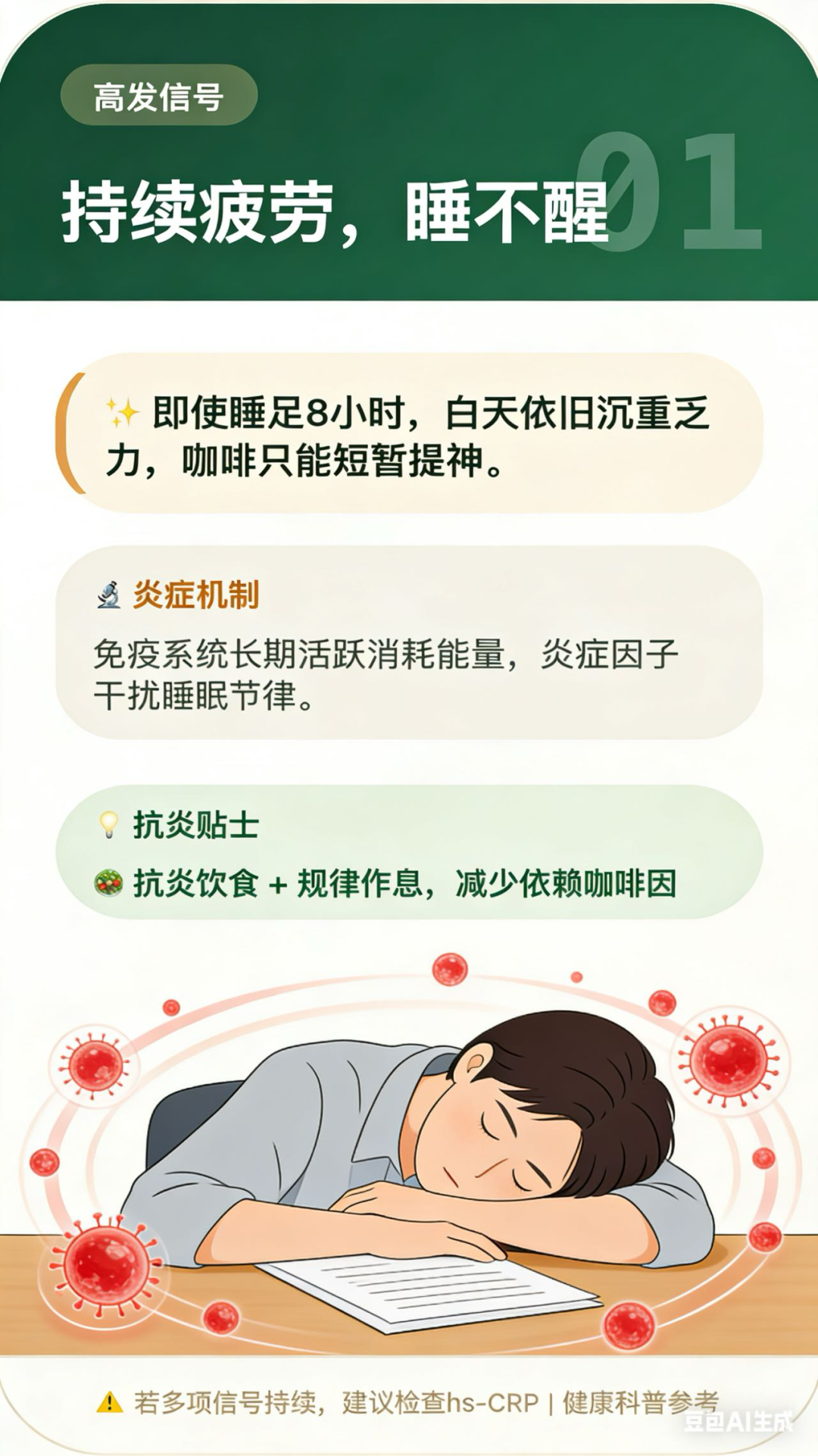 这些信号也可能是甲状腺功能减退、贫血、糖尿病、自身免疫病等其他疾病的表现。不要自行诊断单纯靠“抗炎饮食”而延误正规治疗,建议先去医院做基础检查。